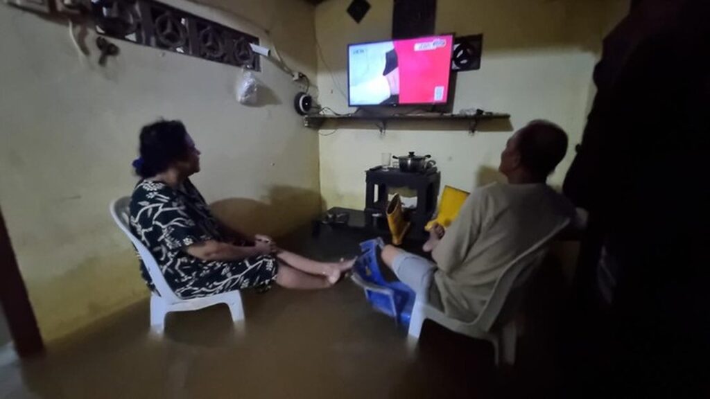Meski rumahnya terendam, seorang warga bernama Suti (60) memilih untuk tetap bertahan bersama suaminya. Mereka terlihat asyik menonton sinetron di dalam rumah, meskipun air hampir menenggelamkan kursi yang mereka duduki.