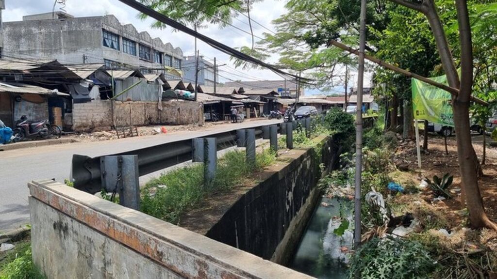 Pantauan di lokasi pada Jumat (8/1/2026) menunjukkan selokan selebar sekitar 1 meter itu dipenuhi air keruh berwarna hitam. Tumpukan sampah berserakan di dalamnya, diapit oleh belukar dan gundukan tanah.