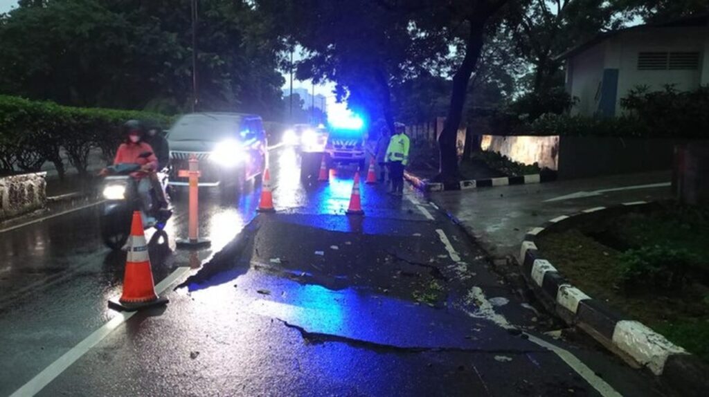 “Terdapat Jalan amblas di Griya Raya Pademangan arena lake side Jakarta Utara, sementara hanya satu lajur yang bisa dilalui,” demikian bunyi laporan dari TMC Polda Metro.