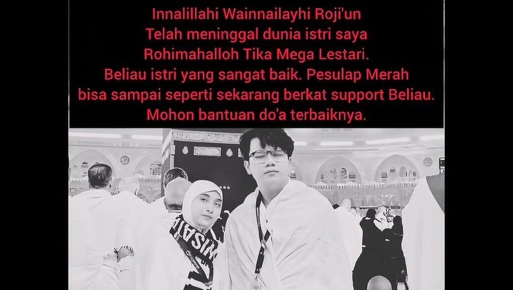 Dalam unggahan lain, Pesulap Merah kembali menegaskan betapa besar peran sang istri dalam perjalanan kariernya. “Innalillahi Wainnalillahi rojiun, telah meninggal dunia istri saya Rohimahallah Tika Mega Lestari. Beliau istri yang baik. Pesulap Merah bisa sampai sekarang berkat support Beliau. Mohon bantuan doa terbaiknya,” tulisnya.