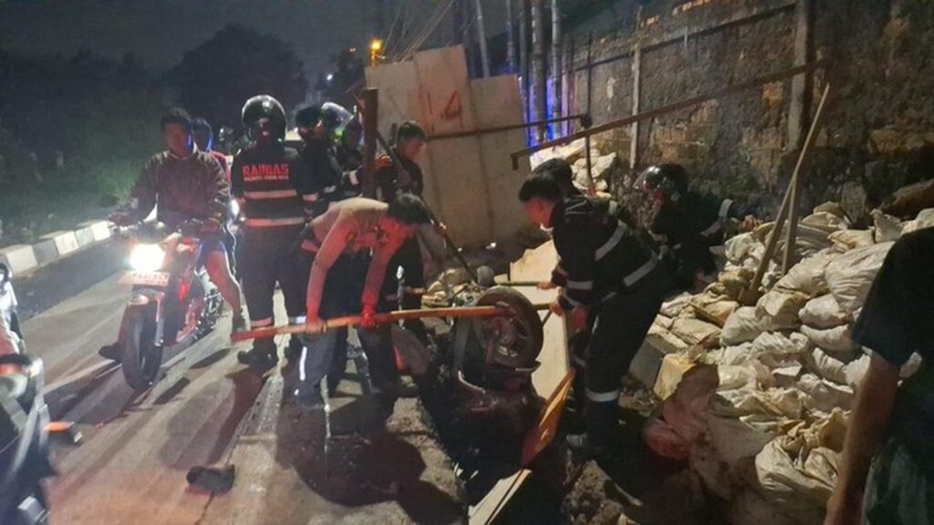 Pantauan di lokasi pada Minggu (11/1/2026) malam, motor korban tergeletak terbalik di dalam lubang galian dengan posisi ban menghadap ke atas. Sejumlah petugas kepolisian yang tiba di lokasi tampak berupaya mengevakuasi motor tersebut menggunakan bantuan kayu.
