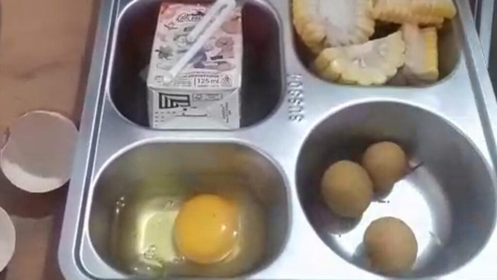 Dalam sebuah video yang beredar, tampak beberapa porsi makanan MBG yang seharusnya disajikan kepada siswa. Video tersebut memperlihatkan seorang guru yang menunjukkan isi ompreng yang terdiri dari buah lengkeng, susu, dan tahu. Namun, yang paling mengejutkan adalah ditemukannya telur yang masih mentah dan potongan jagung yang belum dimasak.