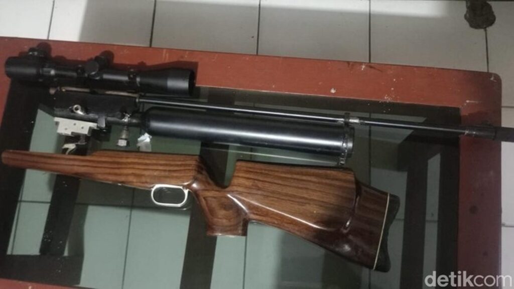 Senapan angin yang digunakan dalam insiden ini merupakan rakitan jenis PCP (Pre-Charged Pneumatic) dengan kaliber 4,5 milimeter. Senjata ini memiliki ciri khas popor kayu berwarna cokelat tua dengan serat yang terlihat jelas. Tabung udara bertekanan tinggi berwarna hitam terpasang sejajar dengan larasnya. Di bagian atas badan senjata terpasang teropong bidik (scope).